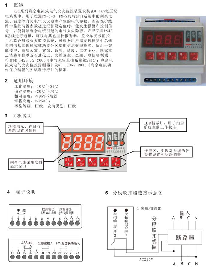 GC系列剩余電流式電氣火災(zāi)監(jiān)控裝置安裝在0.4kV低壓配電系統(tǒng)中,用于檢測(cè)TN-C-S、TN-S及局部TT系統(tǒng)中的剩余電流、溫度等有關(guān)電氣火災(zāi)隱患產(chǎn)生的電氣參數(shù),當(dāng)被保護(hù)線路監(jiān)控裝置參數(shù)超過(guò)報(bào)警設(shè)定值時(shí),能發(fā)生報(bào)警和控制信號(hào),以便消除剩余電流引起的電氣火災(zāi)隱患。產(chǎn)品采用RS485總線進(jìn)行通訊,可以與其它監(jiān)控報(bào)警器、監(jiān)控單元或監(jiān)控主機(jī)聯(lián)合組成火災(zāi)監(jiān)控系統(tǒng),可根據(jù)用戶需要選擇集中總線型的信息管理模式或功能分區(qū)型的信息管理模式。適用于智能樓宇、高層公寓、賓館、飯店、商廈、工礦企業(yè)、國(guó)家重點(diǎn)消防單位以及石油化工、文教衛(wèi)生、金融、電信等領(lǐng)域,符合GB14287.2-2005《電氣火災(zāi)監(jiān)控系統(tǒng)第2部份:剩余電流式電氣火災(zāi)監(jiān)控探測(cè)器》及GB13955-2005《剩余電流動(dòng)作保護(hù)裝置的安裝和運(yùn)行》的標(biāo)準(zhǔn)。