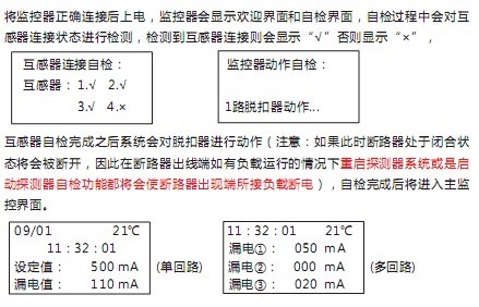 “自檢鍵”用于重新檢測互感器連接狀態(tài)和報警、脫扣輸出動作狀態(tài),自檢時會引起脫扣器動作,使用時務必注意斷路器負載連接情況。