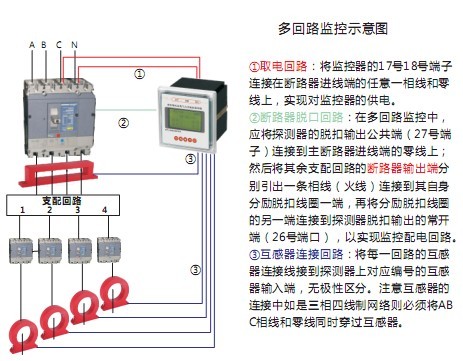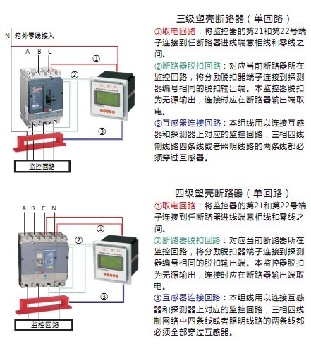 將監(jiān)控器安裝在配電箱的面板或者箱內導軌上,并在箱內合適位置固定剩余電流互感器,使塑殼斷路器的 。
