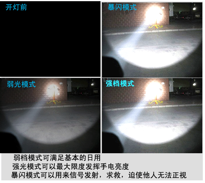 2、采用現(xiàn)役強光照明燈,強光爆閃,三檔照明,強光、弱光、閃光,超亮、省電、節(jié)能、環(huán)保,既亮且照明時間長