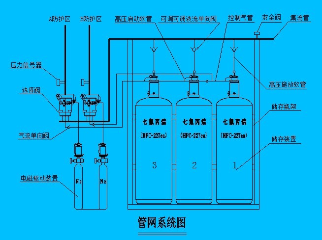 2. 管網七氟丙烷系統主要組成:儲存瓶組、N2啟動瓶組、儲存瓶架、啟動瓶架、高壓輸放軟管、氣流單向閥、液流單向閥、安全閥、集流管、連接氣管、壓力信號器、選擇閥、法蘭、角彎、無縫鋼管、彎頭、三通、直通、噴嘴、七氟丙烷藥劑、氣體滅火控制器、火災探測器、聲光報警器、警鈴、放氣指示燈、氣體啟停按扭等。