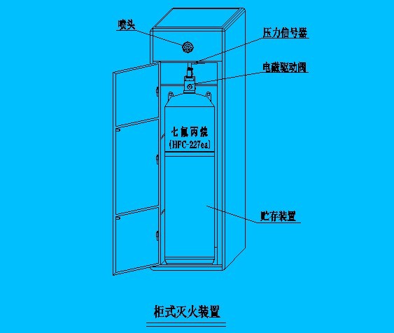 柜式七氟丙烷氣體滅火裝置,又稱無管網七氟丙烷氣體滅火系統(或稱預制滅火系統),是將滅火劑儲存裝置和噴放組件等預先設計,組裝成套且具有聯動控制功能的滅火系統。柜式滅火裝置可以與火災自動報警控制器相連,也可以與消防控制中心相連,給用戶以方便、靈活的選擇,是輕便可移動式自動滅火的現代化消防設備。儲存瓶置于柜體內,裝置為電磁閥啟動,柜體外形美觀,平時放在防護區內,在發生火災時,直接在防護區內噴放滅火。