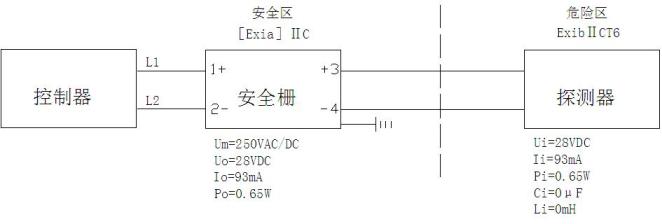 Uo ≤ Ui;Io ≤ Ii;Po ≤ Pi;Cc ≤ Co-Ci;Lc ≤ Lo-Li 其中:Cc、Lc:安全柵到探測器之間連接電纜(或導線)允許總的最大分布電容和電感;Uo:安全柵的最高輸出電壓;Io:安全柵的最大輸出電流;Po:安全柵的最大輸出功率;Lo:安全柵允許的最大外部電感;Co:安全柵允許的最大外部電容;Ui:探測器的最高輸入電壓;Ii:探測器的最大輸入電流;Pi:探測器的最大輸入功率;Li:探測器的最大內部電感;Ci:探測器的最大內部電容。 符號詳細意義見GB3836.4-2000標準。 |