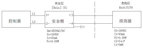 其中:Cc、Lc:安全柵到探測器之間連接電纜(或導線)允許總的最大分布電容和電感;Uo:安全柵的最高輸出電壓;Io:安全柵的最大輸出電流;Po:安全柵的最大輸出功率;Lo:安全柵允許的最大外部電感;Co:安全柵允許的最大外部電容;Ui:探測器的最高輸入電壓;Ii:探測器的最大輸入電流;Pi:探測器的最大輸入功率;Li:探測器的最大內部電感;Ci:探測器的最大內部電容。