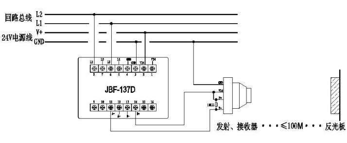 注意事項: 探測器、反光板應安裝在穩定可靠的建筑物表面。探測距離小于50米時用一塊反光板,探測距離大于50米小于100米時用4塊反光板。 接線示意圖: