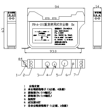 端子1、2為非本安端,接安全區(qū)控制器;端子3、4為本安端,接防爆區(qū)探測器;端子5、6為接地端;