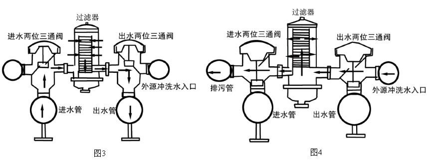 待處理水由進水管進入兩位三通閥,經閥門控制,水流進入各個單元過濾。過濾后的水從過濾單元內部通道流入出水口。隨過濾的進行,過濾器吸附的雜質增多,當壓力差達到設定值或設定時間時,系統進入反沖洗模式。控制器首先發信號給第一個過濾單元對應的三通閥,該閥將改變水流的方向,關閉進水導通排污口。反沖洗水在壓力作用下經出水管沖入過濾器進行洗滌,污水由排污口派出。洗滌完畢該單元恢復過濾模式,系統對下一單元進行反沖洗,直到所有單元沖洗完畢系統恢復過濾模式。根據出水管壓力情況,在壓力不足以支持反沖洗的情況下,將在出水管安裝電動磁閥控制水流量以滿足沖洗要求。(如圖1,圖2)
