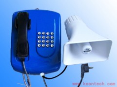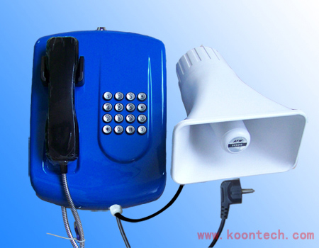 KNZD-04型電話機本身防護等級很高,壁掛式安裝,裝在指定的崗位或巡檢路程長的地方(廊道內)。按巡檢人員流動情況外圍空曠的地方(煤場)設置廣角揚聲器。揚聲器直接通過KNZD-04型電話機內部的主電路控制。