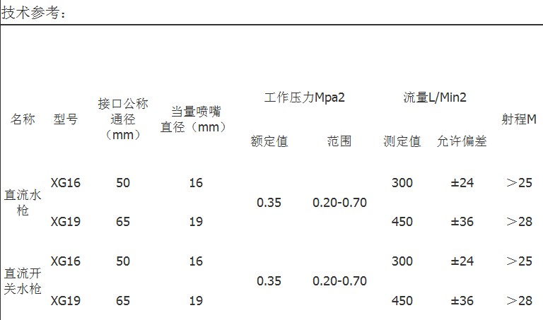 品名:消防水槍 規格:50mm 65mm 產品介紹:是滅火的射水工具,用其與水帶連接會噴射密集充實的水流。具有射程遠、水量大等優點。它由主管牙接口、槍體和噴嘴等主要零部件組成。直流開關水槍,是直流增加球閥開關等部件組成可以通過開關控制水流。