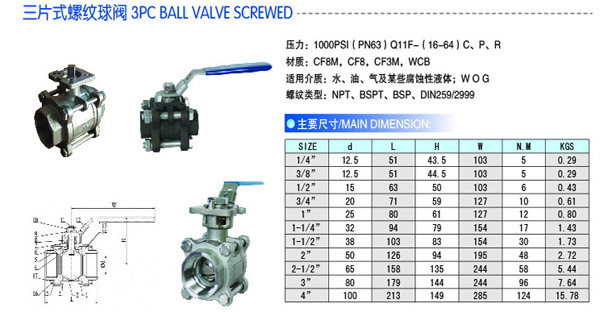 注意事項:本文中所有文字、數(shù)據(jù)、圖片均只適用于參考,1000PSI不銹鋼三片式螺紋球閥/2000WOG三片式螺紋球閥性能參數(shù)、結(jié)構(gòu)尺寸參數(shù)、價格等詳情,請聯(lián)系我們的銷售、技術(shù)工程師,電話:021-60547995/64966685。