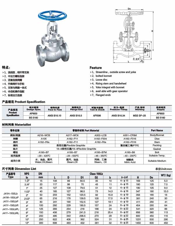 注意事項:本文中所有文字、數據、圖片均只適用于參考,J41H-150LB美標法蘭截止閥性能參數、結構尺寸參數、價格等詳情,請聯系我們的銷售、技術工程師,電話:021-60547995/64966685。