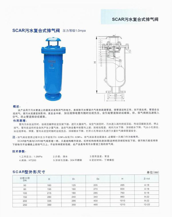 典昭的SCAR污水復合式排氣閥原理與清水復合式排氣閥相同,只是將結構略作改動,即將閥體加高,杠桿機構稍微改動(如圖)。這樣控制部分降低,使污物只在閥體下部,不會纏繞上部排氣部分機構,不影響排氣,不致漏水,排氣量與CARX型相同。污水復合式排氣閥用于污水管道上的最高點或有閉氣的地方,來排除污水管道內氣體來疏通管道,使管道運轉正常。如不裝此閥,管道會出現閉氣,使污水流速受到影響,甚至會中斷,如出現停電管內隨時出現負壓,會引起管道振動或破裂,排、吸氣閥就迅速吸入空氣,防止管道振動或破裂。