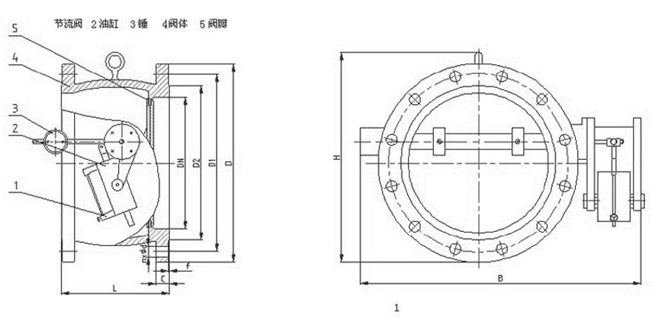 蝶式緩沖止回閥產(chǎn)品外形連接尺寸: