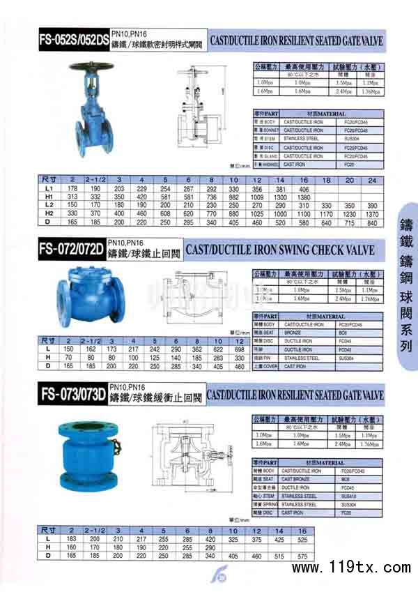 臺灣富山FS072鑄鐵橫式止回閥由閥體、閥蓋及橡膠瓣三種主要零件組成。其中橡膠瓣由鋼板、鋼棒及強化尼龍布作襯底,外層披覆橡膠制成,閥瓣開關壽命可達100萬次,該閥采用全流面積式設計,具有水頭損失小,不易堆積雜物,維修簡便等特性。該閥主要適用于給排水系統,可安裝于水泵出水口處,以防止倒流及水錘對泵損害。該閥還可安裝在蓄水池進出水管的旁通管上,以防止池水倒流至給水系統中。