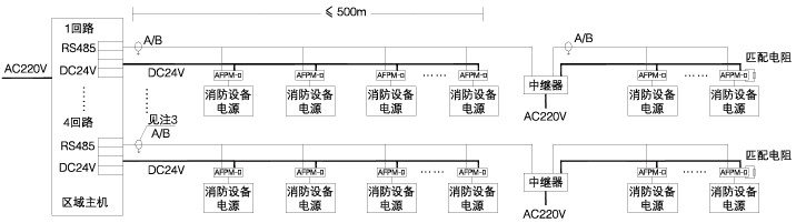 ?傳輸距離大于500m時(shí),需加中繼器,1合中繼器占用1個(gè)傳感器(監(jiān)控模塊)地址,中繼器的AC220V電源線采用3*1.5mm^2,由現(xiàn)場消防電源或消防監(jiān)控室監(jiān)控器(主機(jī))提供。