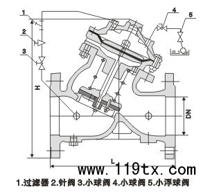 F745X隔膜式遙控浮球閥是兼具多種功能的水力操作式閥門。主要安裝于水池或高架水塔的進(jìn)水口處,當(dāng)水位達(dá)到設(shè)定的高度時(shí),主閥由浮球?qū)чy控制關(guān)閉進(jìn)水口停止供水;當(dāng)水位下降后,主閥由浮球?qū)чy控制打開進(jìn)水口向水池注水,實(shí)現(xiàn)自動(dòng)補(bǔ)水。液位控制精確,不受水壓干擾;隔膜式遙控浮球閥可隨水池的高度及使用空間任意位置安裝,維護(hù)、調(diào)試、檢查方便、密封可靠、使用壽命長。隔膜式閥門性能可靠、強(qiáng)度高、動(dòng)作平穩(wěn)適用于450口徑以下的管道。