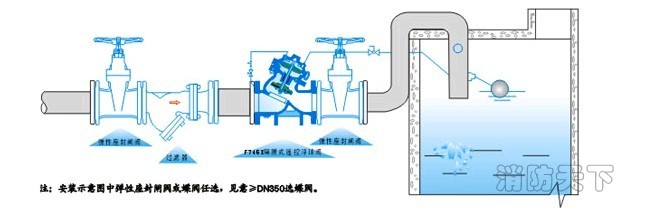 F745X遙控浮球閥安裝在水池、水塔的進水管道中,當水池水位達到預設定水位時,閥門自動關閉;當水位下降時,閥門自動開啟補水。