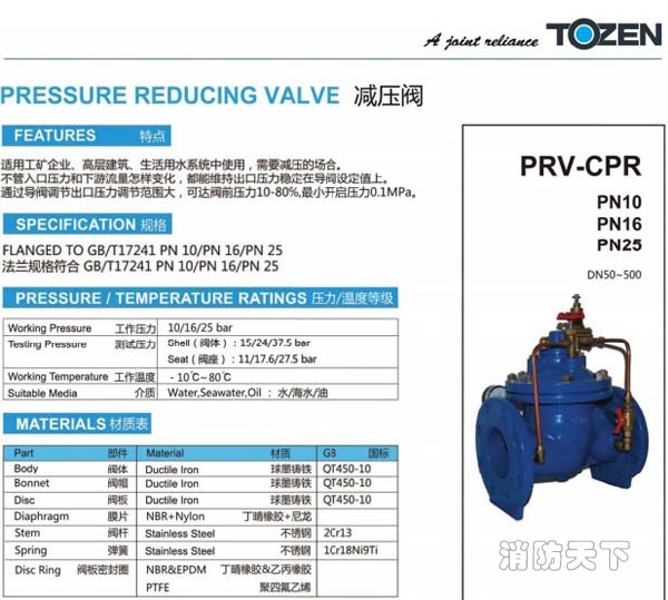 TOZEN PRV-CPR可調試減壓閥利用導閥自力控制,不需要其它裝置和能源,保養簡便,壓力控制準確度高,受進口壓力和流量影響小,減壓穩壓可靠。廣泛用于高層建筑、生活區等供水管網系統及城市供水工程。
