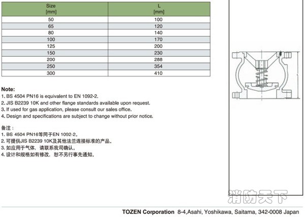 TOZEN ESCV-WB消聲止回閥 這種閥門是自動工作的,在一個方向流動的流體壓力作用下,閥瓣打開;流體反方向流動時,由流體壓力和閥瓣的自重合閥瓣作用于閥座,從而切斷流動。不宜用于含有固體顆粒和粘度較大的介質(zhì)。當(dāng)介質(zhì)按規(guī)定方向流動時,閥瓣受介質(zhì)力的作用,被開啟;介質(zhì)逆流時,因閥瓣自重和閥瓣受介質(zhì)反向力的作用,使閥瓣與閥座的密封面密合而關(guān)閉,達(dá)到阻止介質(zhì)逆流的目的。