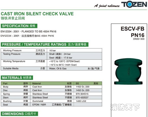 TOZEN ESCV-WB消聲止回閥是安裝在水泵出口管道上用于水泵停機(jī)時防止管路中有高壓水流沖擊水泵倒轉(zhuǎn)的損害。