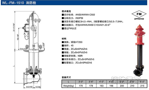 FM認(rèn)證消防栓結(jié)構(gòu)尺寸: