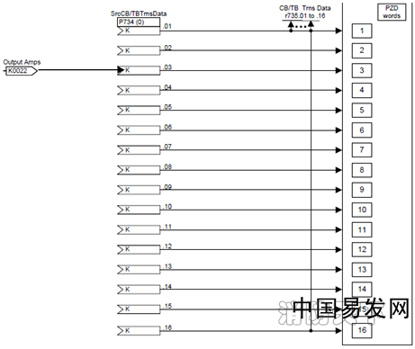 根據《6SE70使用大全V3.4使用大全》功能圖125,參數P734.01~P734.16為變頻器發送給DP主站的16個PZD字的參數化接口。P734.01默認值為K0032,代表通過第一個PZD將狀態字1發送的DP主站。同理若要求用第3個PZD將變頻器輸出電流值傳給DP主站,則 P734.03 = K0022(Output Amps);這樣在DP主站側所接收的第3個PZD的數值就是變頻器輸出電流。如圖1.1所示,可以通過參數r735.01到.16來從變頻器側讀數所發送的數值。