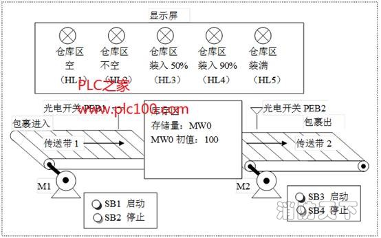 在兩臺傳送帶之間有一個倉庫區。傳送帶1將包裹運送至倉庫區,傳送帶1由電動機M1驅動。傳送帶2將包裹運出倉庫區,傳送帶2有電動機M2驅動。傳送帶1靠近倉庫一端安裝光電開關PEB1確定入庫的包裹數,傳送帶2靠近庫區一端安裝光電開關PEB2確定出庫的包裹數。