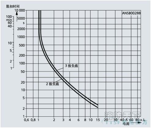 下圖為 3RU61/3RU51 熱過載繼電器的反時限脫扣特性曲線,對應于冷態條件。在工作溫度下,脫扣時間將減少 25 % 左右。
