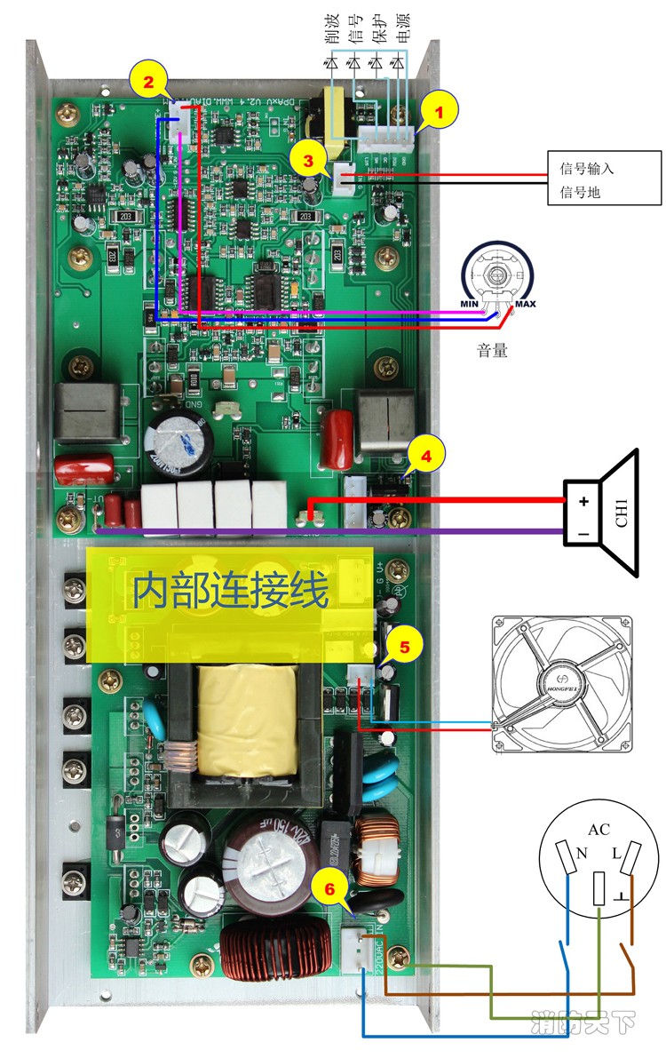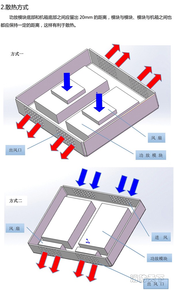 4、為方便機箱結構設計,實際使用建議采用方案2的散熱方式,散熱效率雖然低一些,但散熱效果是可以保障的。因為實際應用中功放并不是處于連續額定功率狀態,發熱量也比較小。